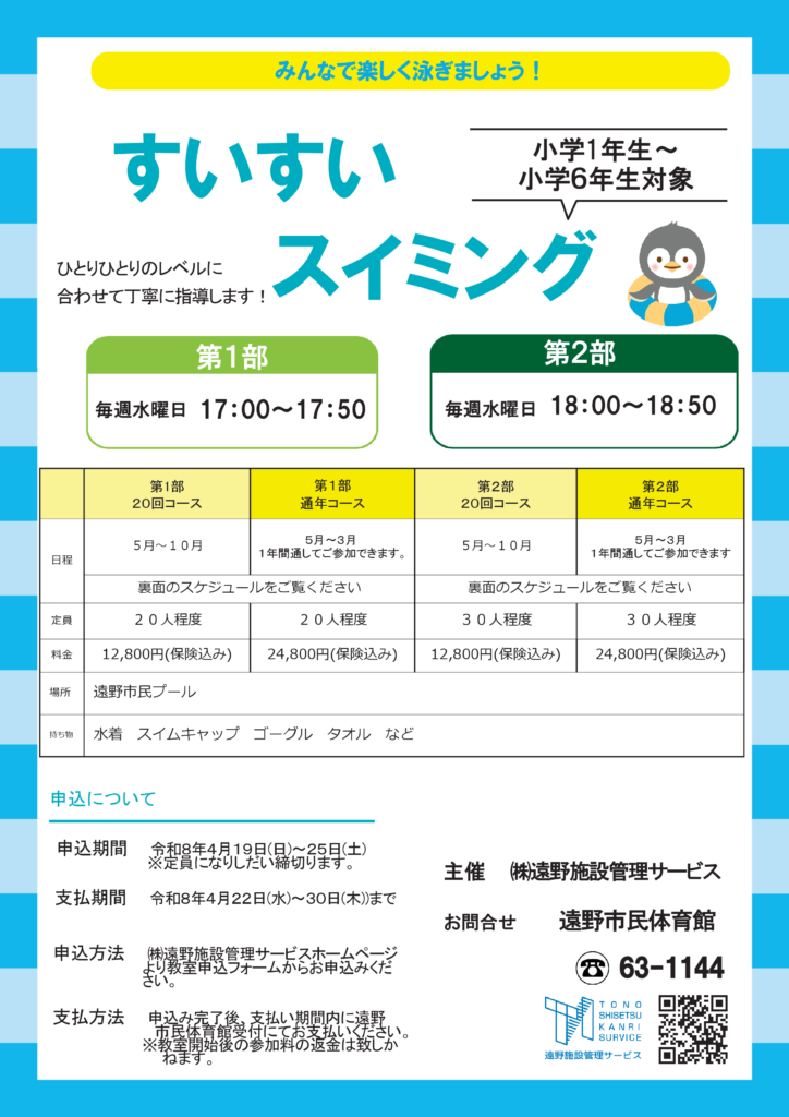 [遠野市民プール]すいすいスイミング(小学生対象)【通年】【20回1期】募集のおしらせ