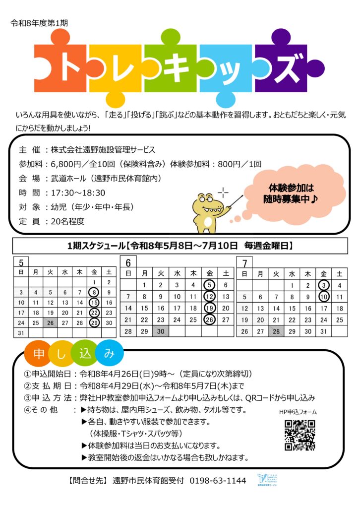 令和8年度のトレキッズ第1期募集のおしらせです。受講を希望する方は、申込期間中に下記に表示されるリンク先の専用フォームよりお申込みください。