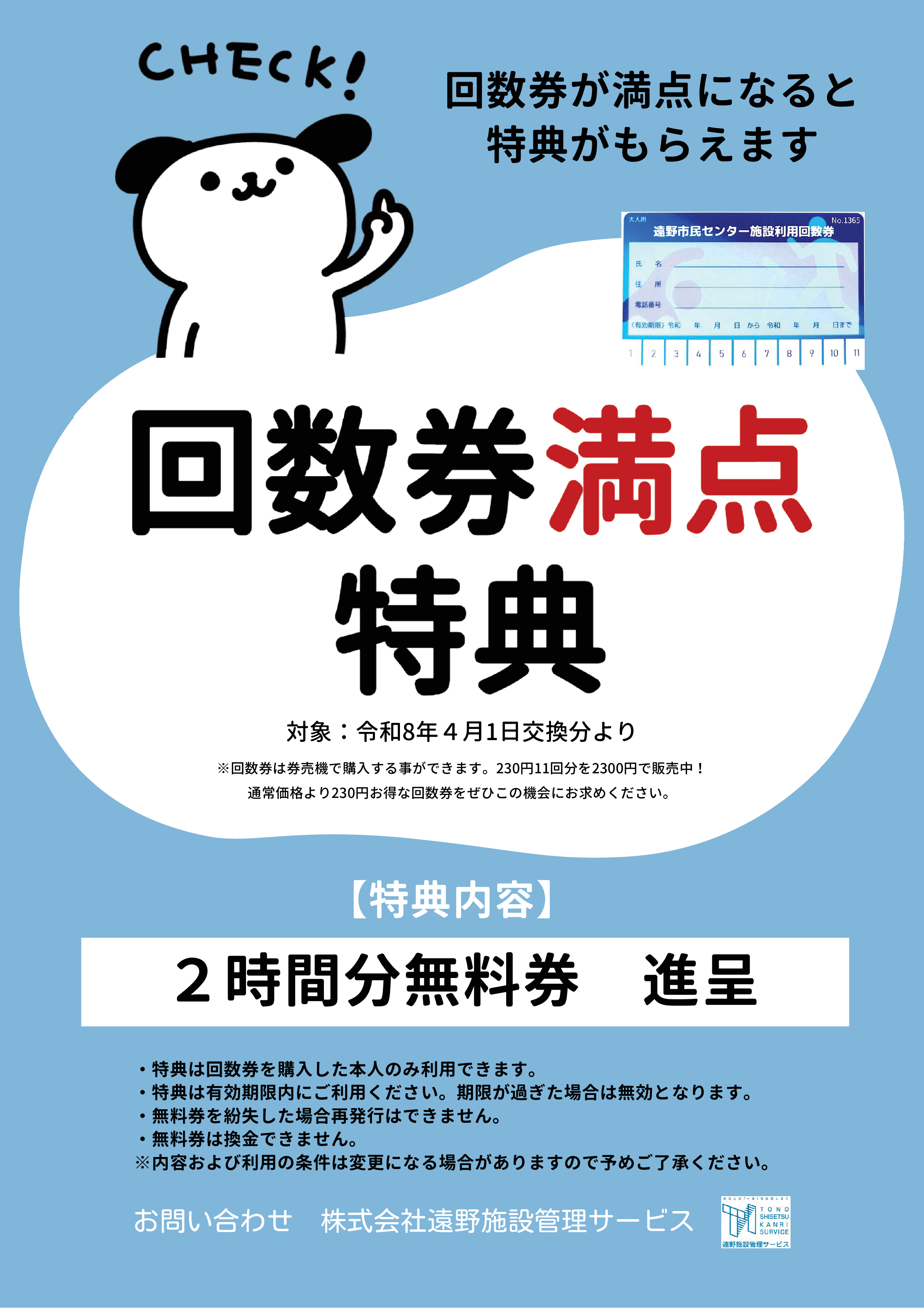 | 注意事項 | ・回数券は、遠野市民体育館内の施設の個人利用にお使いいただける券です。 ・230円×11回分を2,300円で販売中です。回数券のお求めは、遠野市民体育館の券売機で購入することができます。 ・内容および利用の条件は変更になる場合がありますので予めご了承ください。 【特典利用条件】 ・他のキャンペーン、割引との併用はできません。 ・特典は回数券を購入した本人のみ利用できます。 ・各特典は有効期限内にご利用ください。期限が過ぎた場合は無効となります。 ・無料券は1回の利用につき1枚まで、当日限り有効です。 ・無料券を紛失した場合、再発行は致しかねます。 ・無料券の換金はできません。 ・内容および利用条件は変更になる場合がありますので予めご了承ください。 |