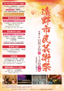 2025年10月22日 / 最終更新日時 : 2025年10月22日 s.abe 文化施設 遠野市民センターバレエスタジオ 第48回発表会 みやもりホール、市民センターにてチケット販売中! 公演日 令和7年11月23日(日)開場13:30開演14:00 場所 遠野市民センター 大ホール 料金 一般 1,000円(当日 1,200円)高校生以下 600円(当日 800円)※未就学児入場無料 プレイガイド とぴあ・みやもりホール・遠野市民センター・遠野市教育文化振興財団 お問いあわせ (一財)遠野市教育文化振興財団 ☎0198-62-6191